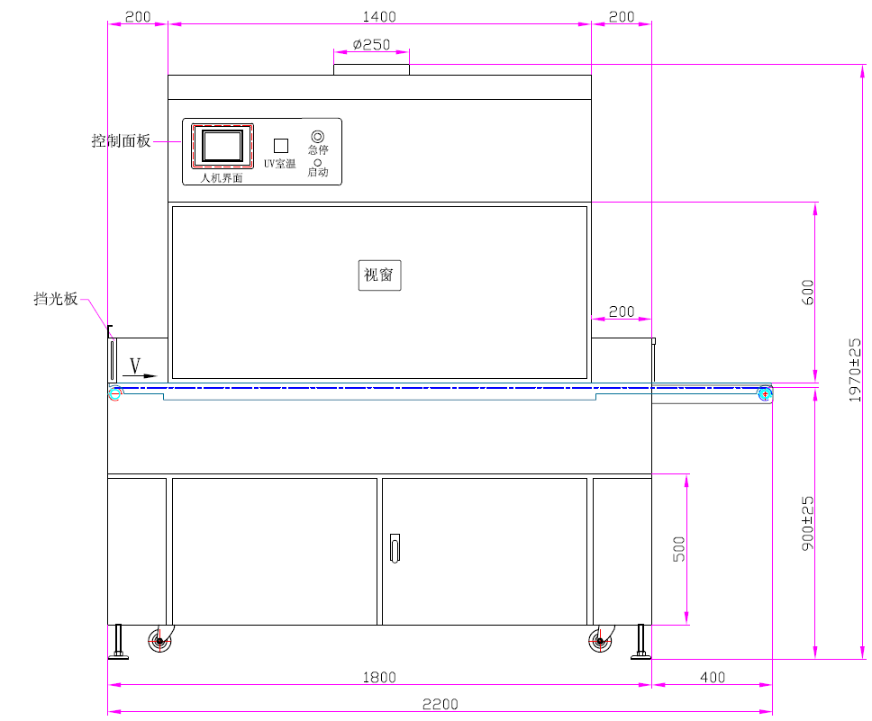 1、UV燈功率:5.0kw*4支(UV汞燈) | 2、UV燈總長:620mm、弧長:500mm |