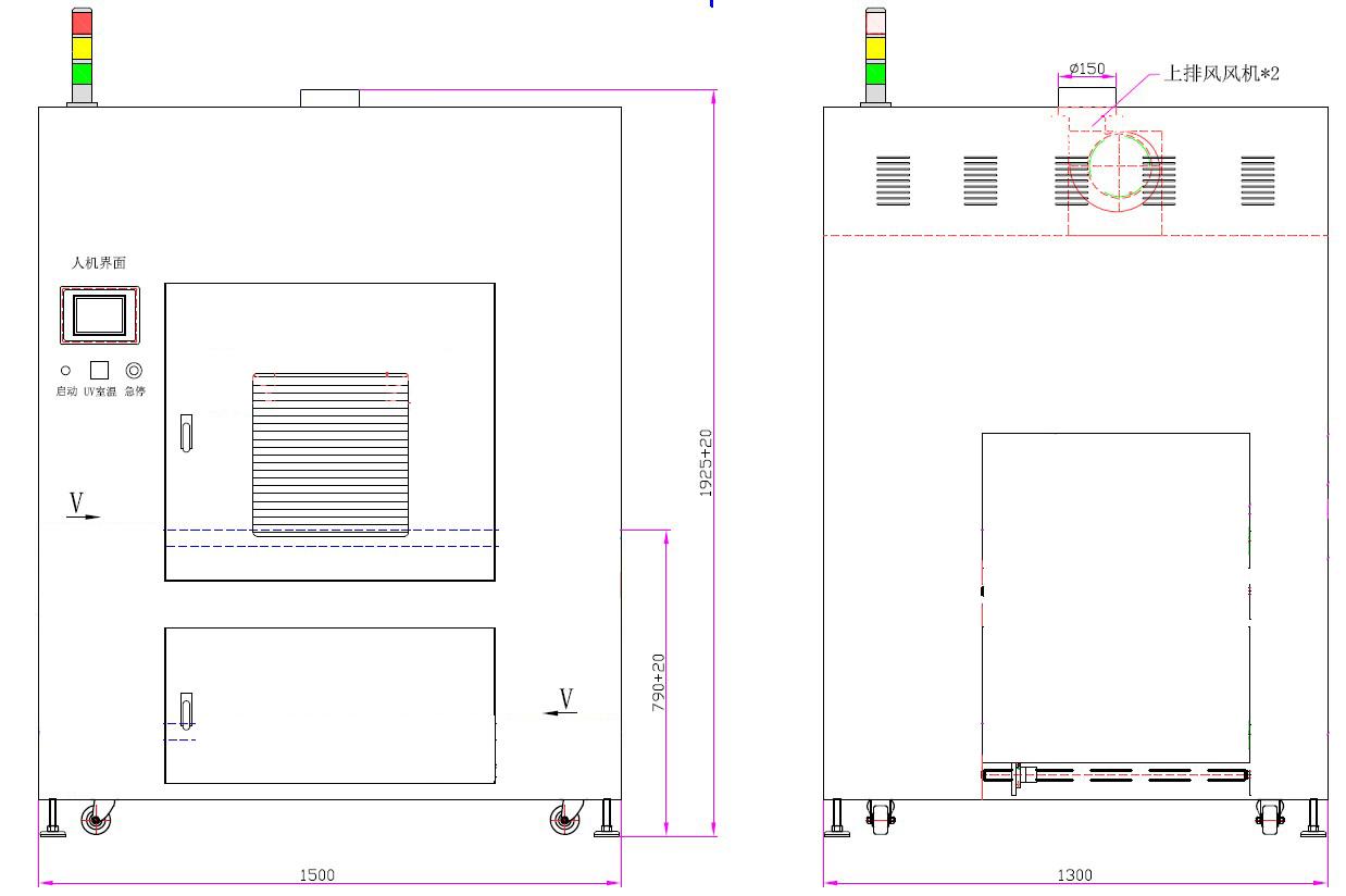 | 7、UV燈高度電動調節,軌道手動調節 | 8、采用上排風係統 |